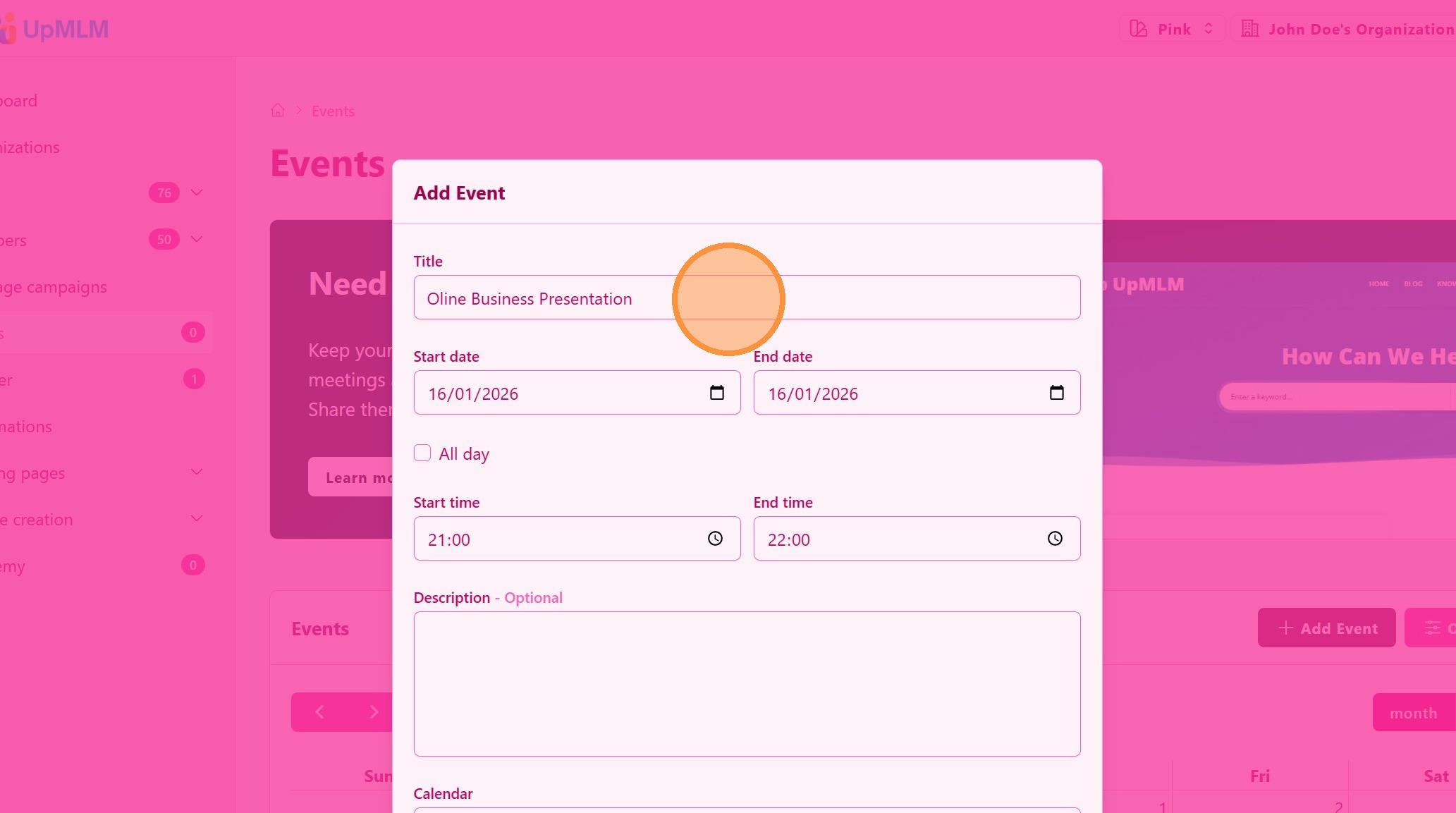 In this tutorial, you will learn how to create and share a calendar event in UpMLM. By the end of this guide, you will be able to schedule events, invite participants, and ensure everyone is informed and prepared.