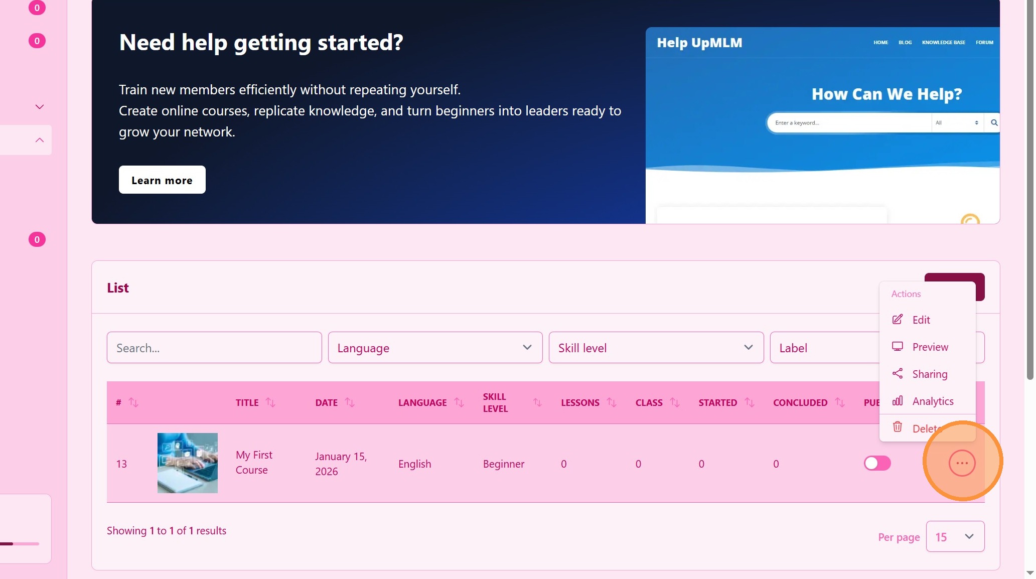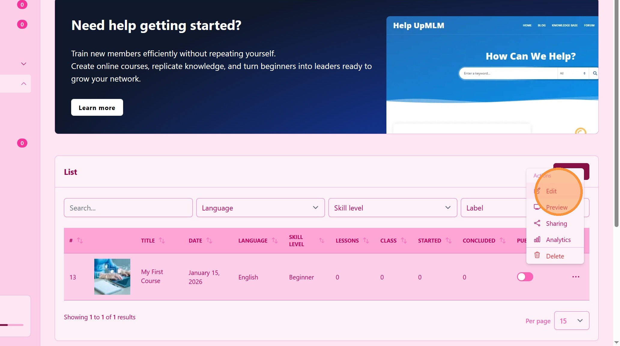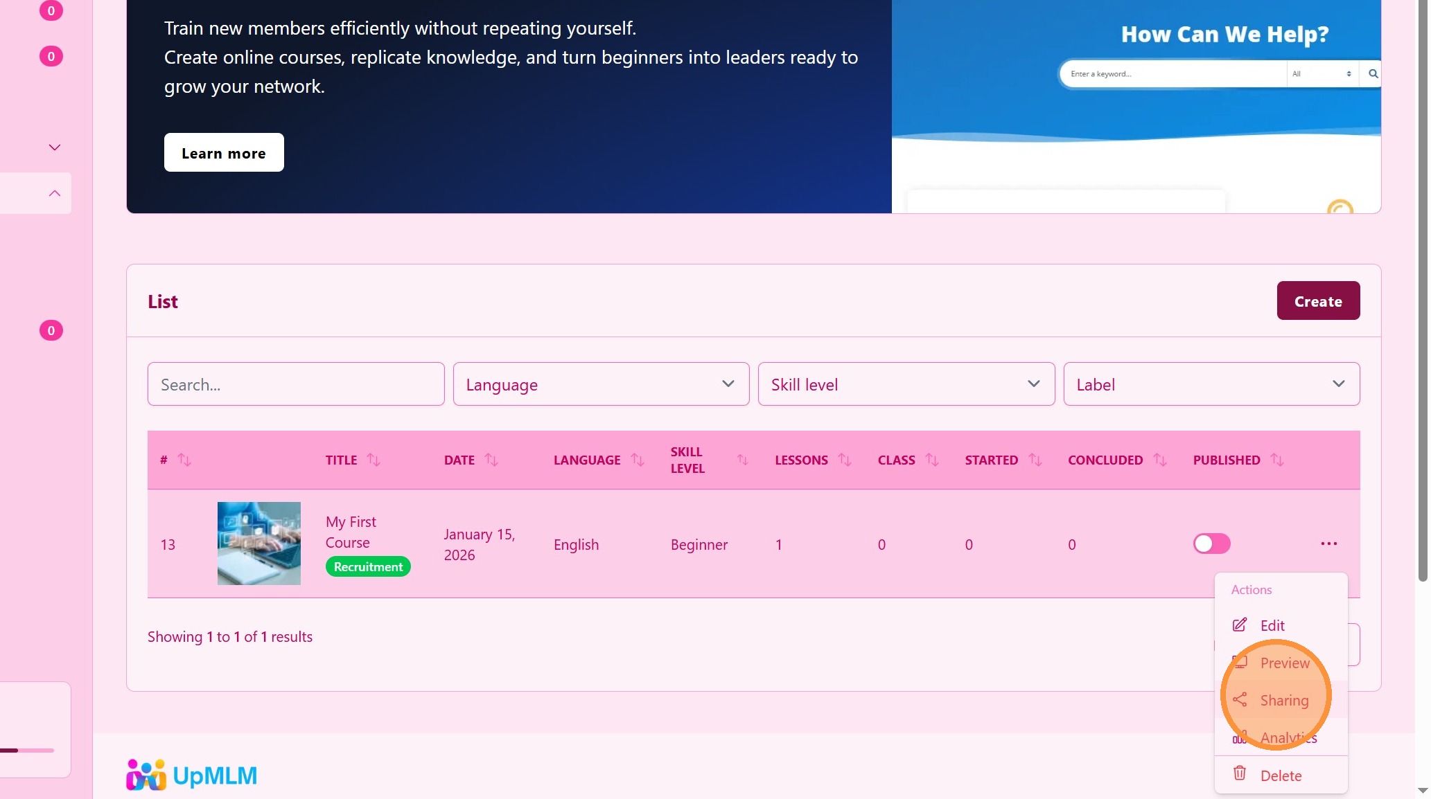 In this tutorial, you will learn how to create and publish a course in UpMLM. By the end of this guide, you will be able to structure course content, configure course settings, and make the course available to your team.