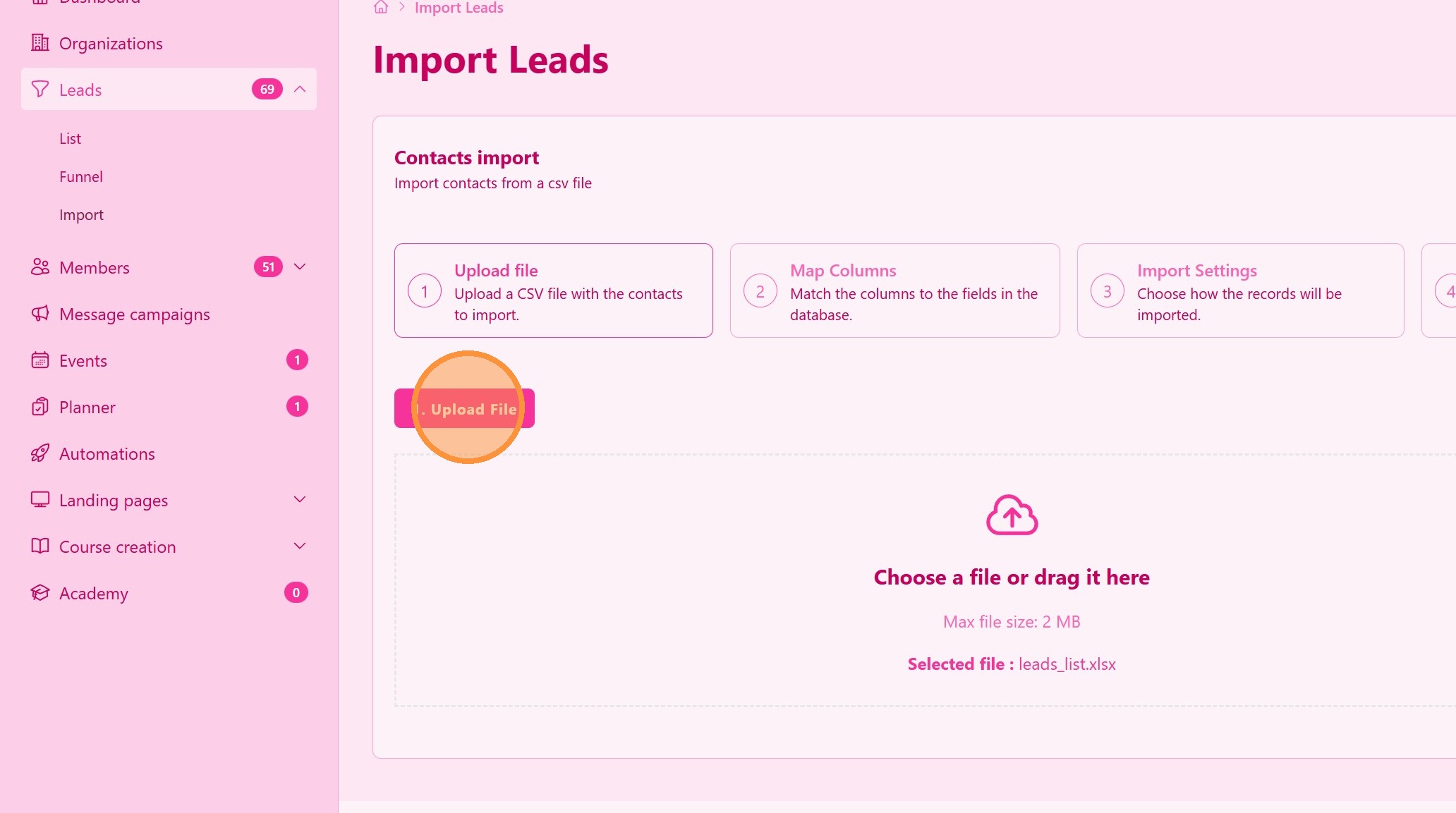 Click Import Contacts to start the file upload and leads processing.