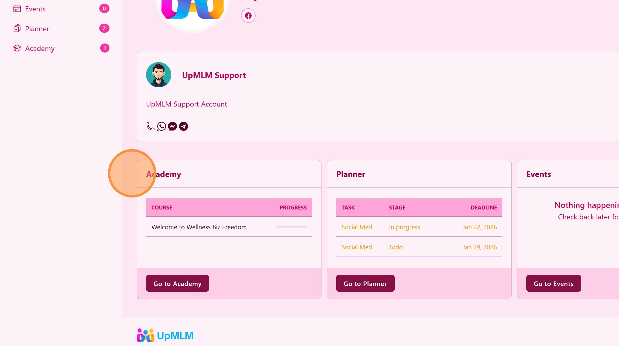 U ovom ćete vodiču naučiti gdje pronaći tečajeve, događaje i zadatke planera koje je podijelila vaša nadređena osoba u UpMLM-u. Do kraja ovog vodiča moći ćete pristupiti materijalima za timsku obuku, prisustvovati zakazanim događajima i slijediti dodijeljene korake za akciju kako biste napredovali unutar svoje MLM organizacije.