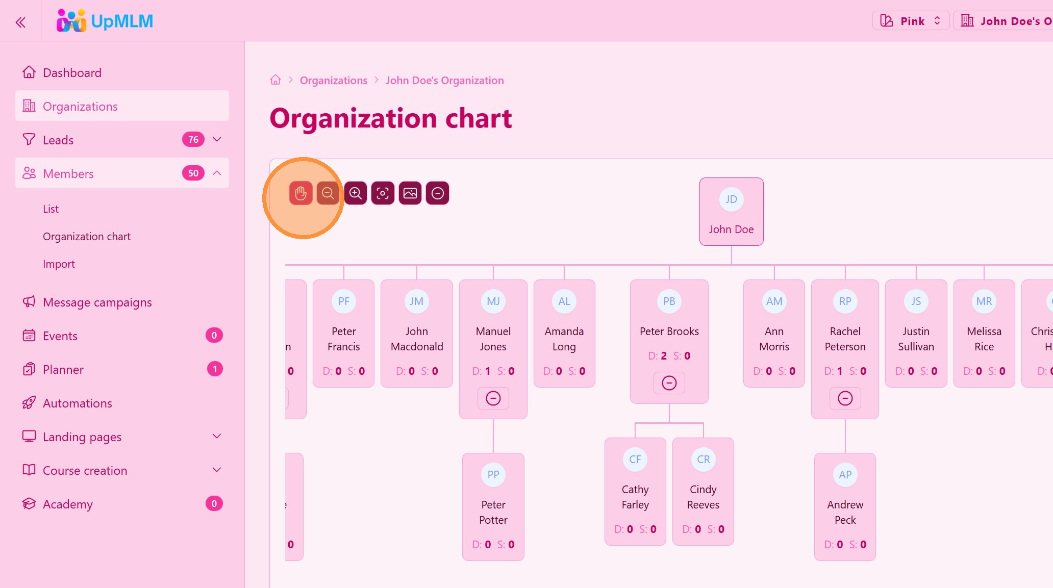 Visualizar sua árvore organizacional no UpMLM fornece uma visão clara da estrutura da sua equipe e dos relacionamentos. Esta visão visual apoia uma melhor tomada de decisão, desenvolvimento de liderança e crescimento estratégico dentro da sua organização.