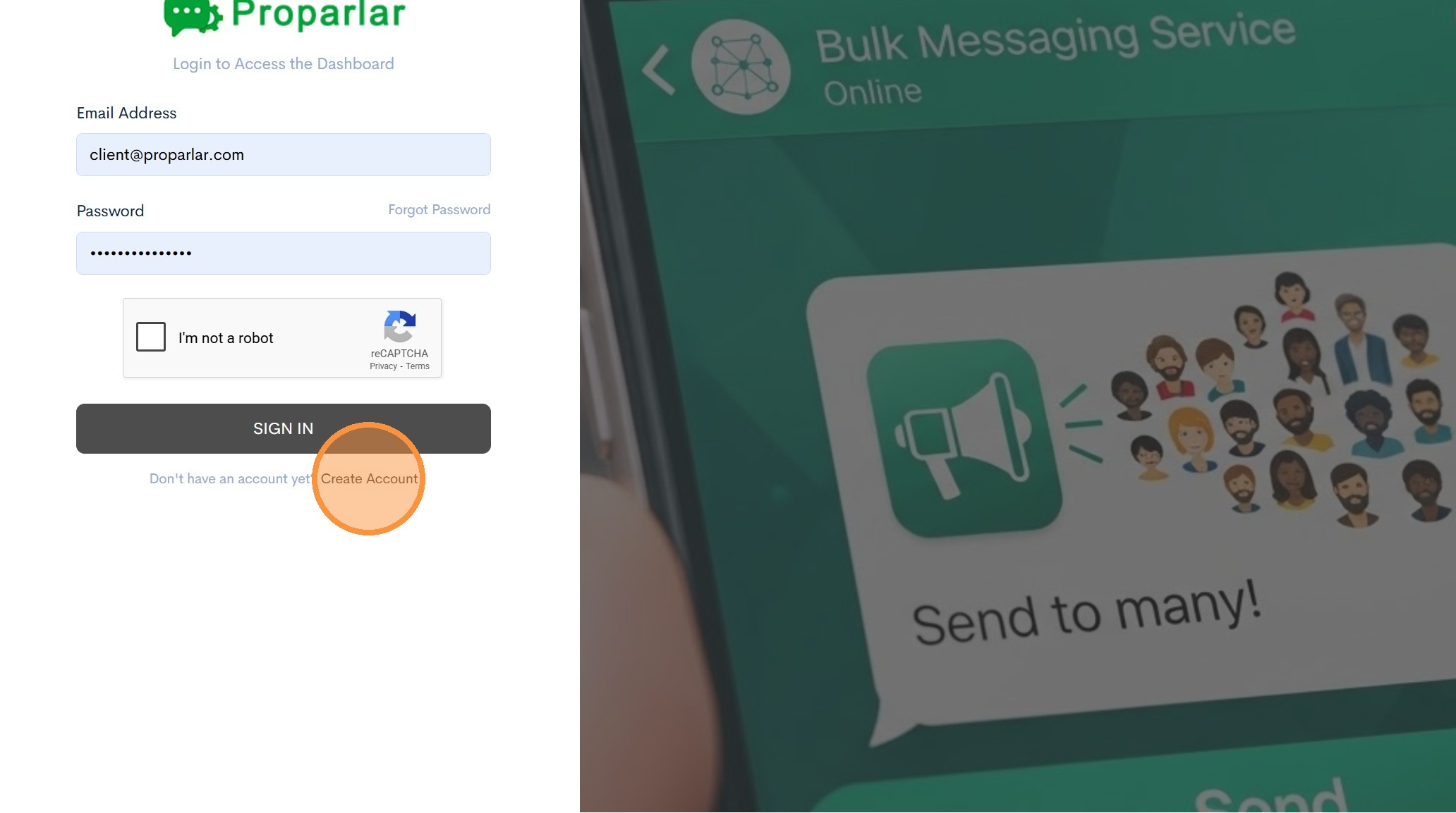 Se não tiver uma conta Proparlar, clique em Criar Conta e siga os passos de registo.