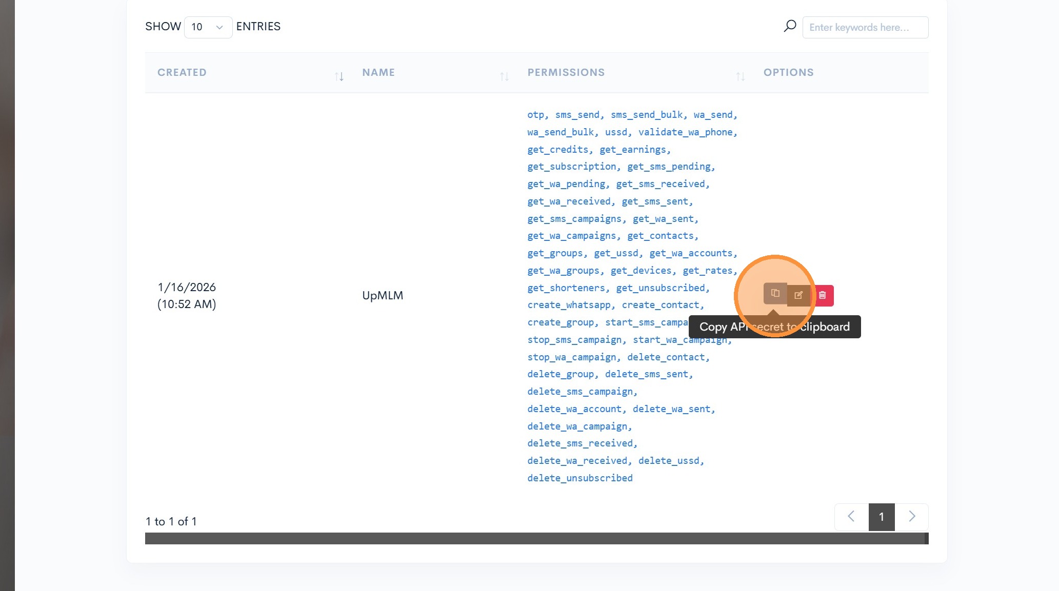 Clique no ícone de copiar para obter o segredo da CHAVE API. Não partilhe esta chave com ninguém.