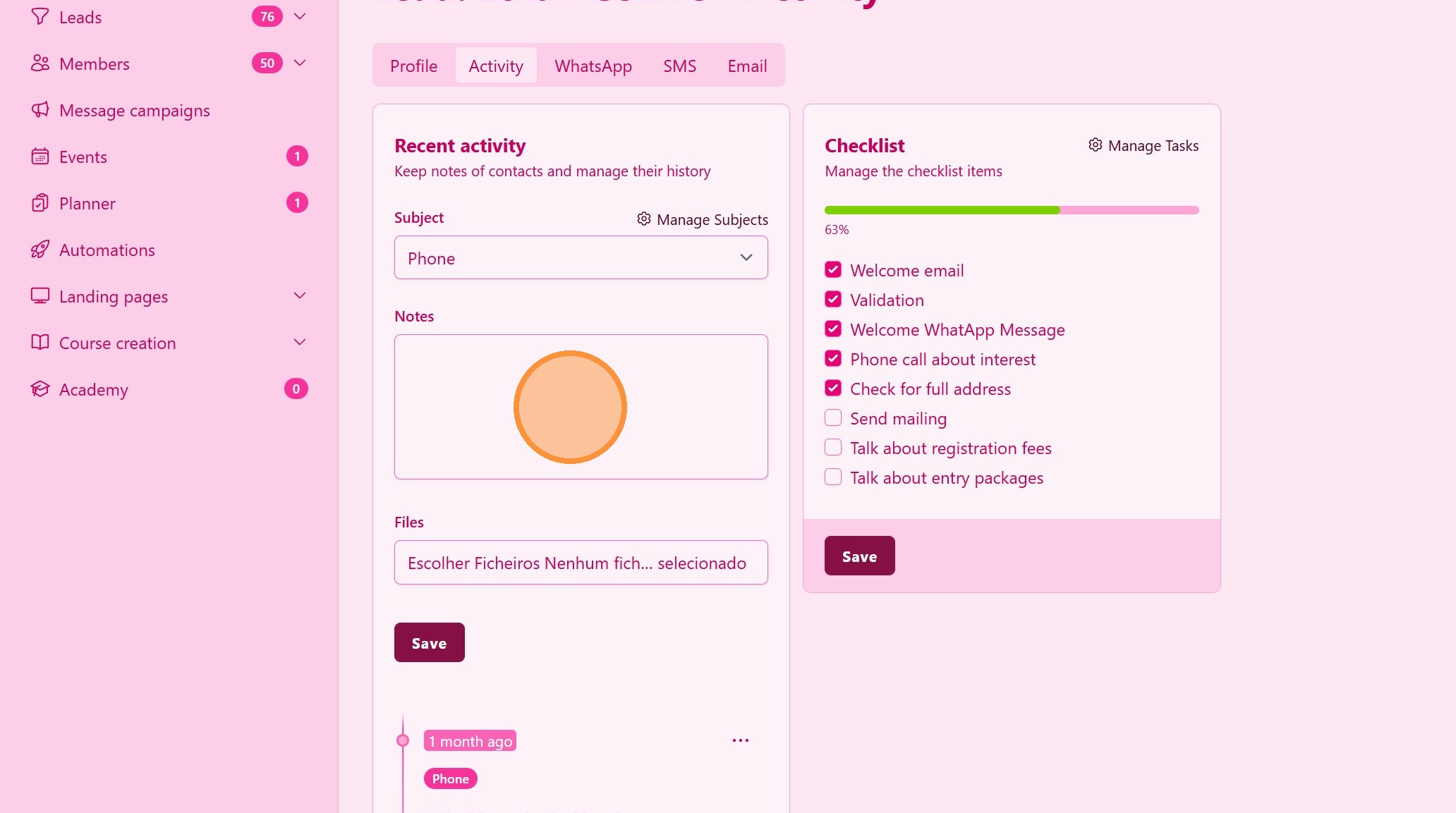 Виберіть вкладку Активність, щоб відкрити інструмент нотаток та завдань з контрольним списком