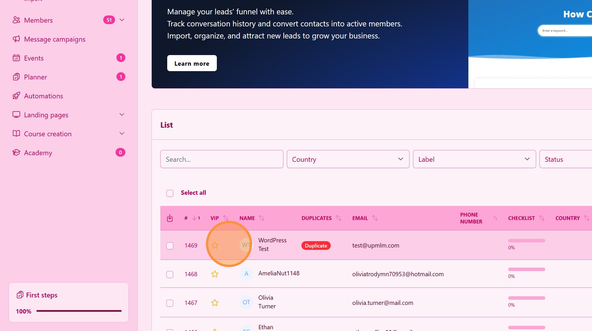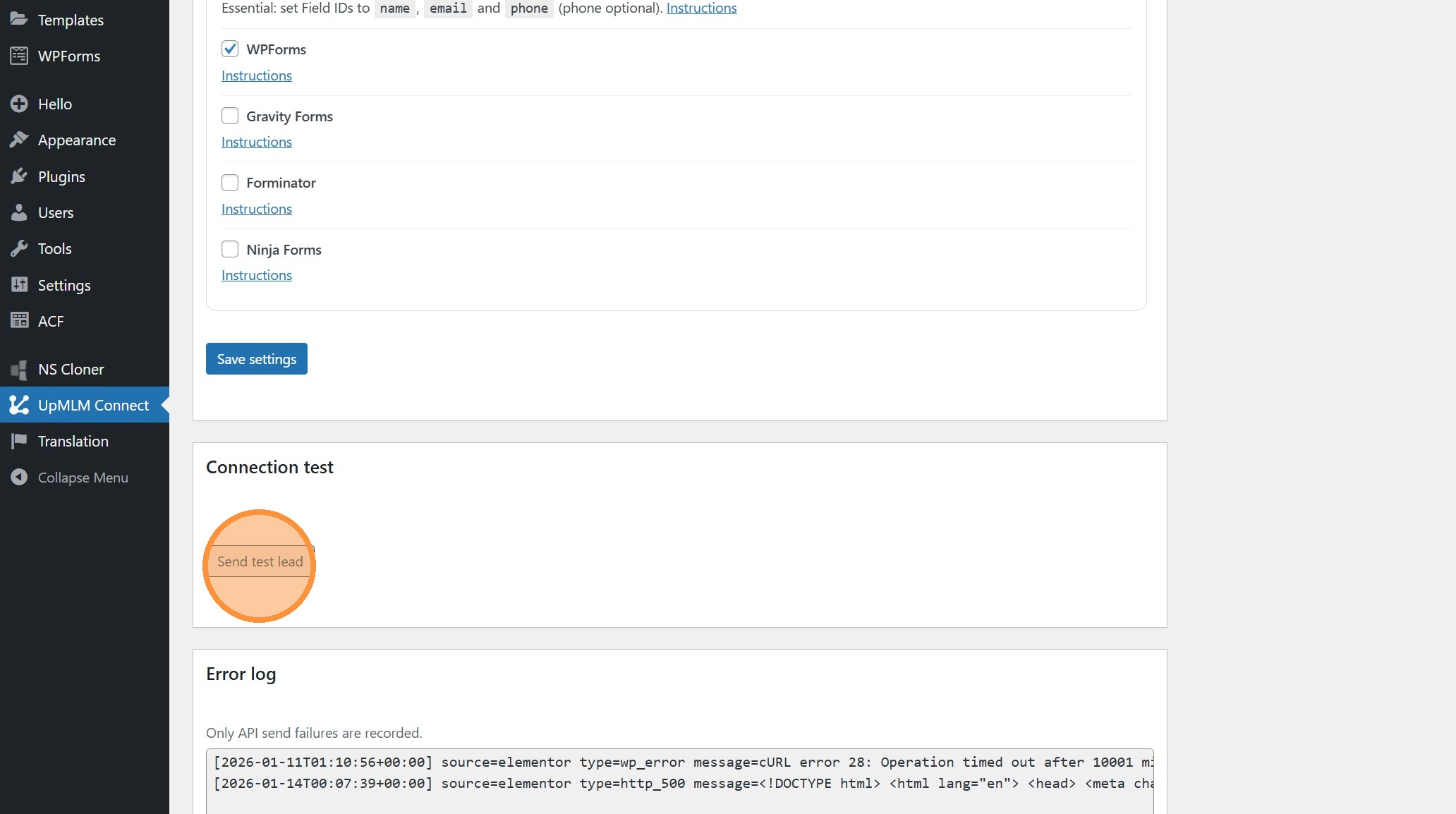 Click "Send test lead" to send a dummy lead to your UpMLM account