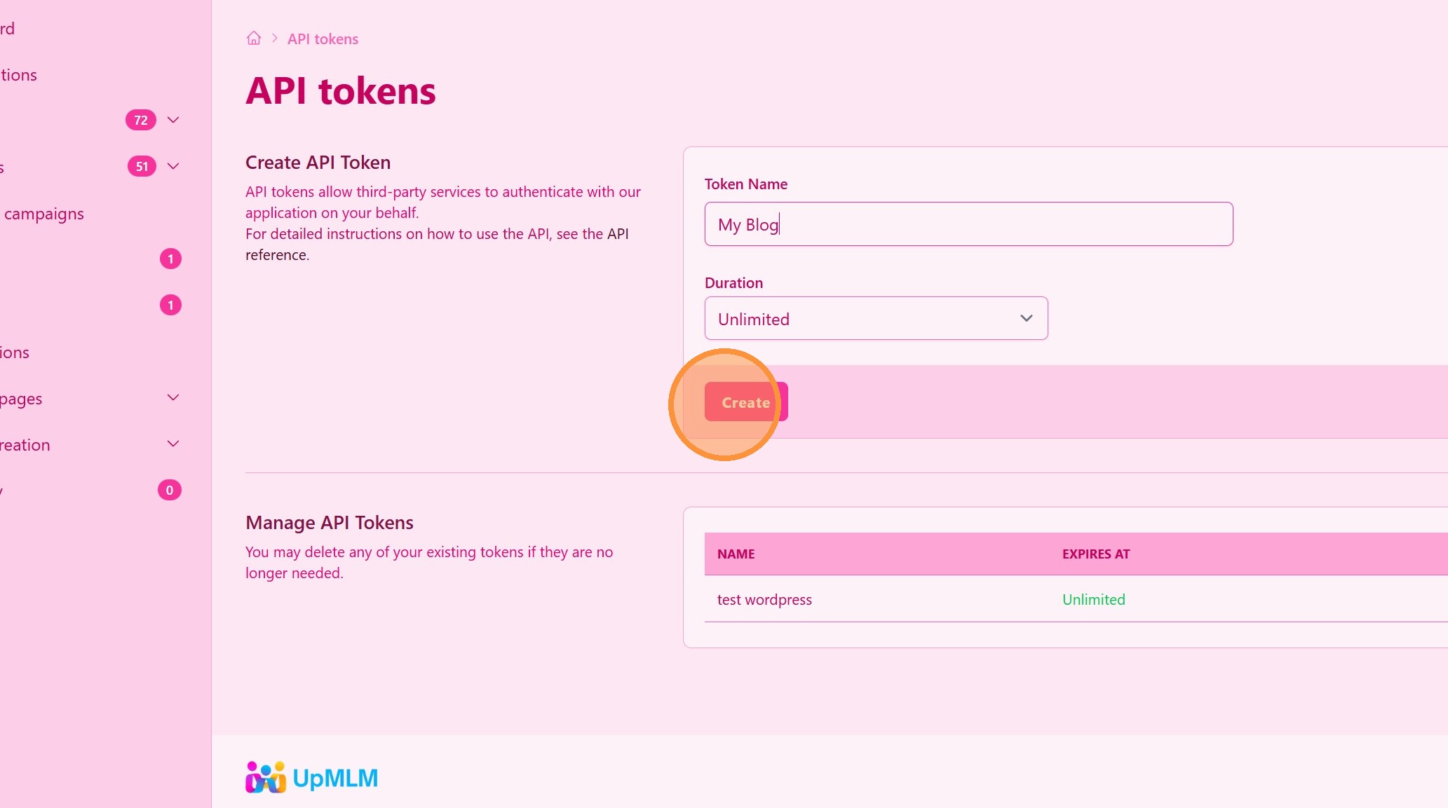 > This section allows you to generate API tokens to connect external tools and data sources to UpMLM.